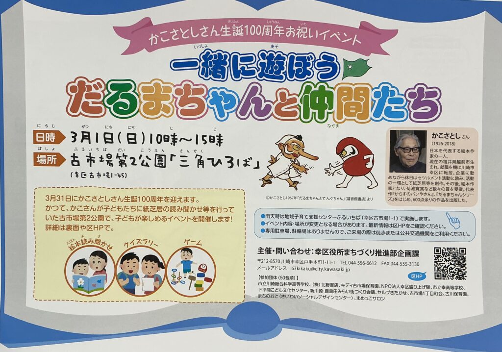 2026年3月1日川崎市幸区でかこさとし生誕100周年お祝いイベント「一緒に遊ぼう だるまちゃんと仲間たち」