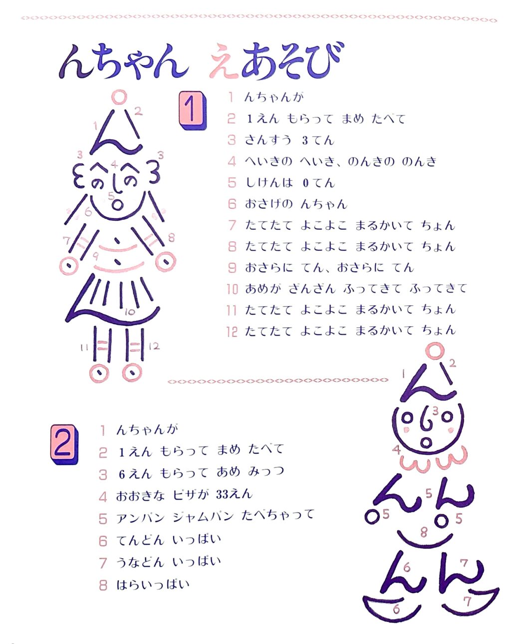 ご存知のように絵描き遊びでは直線や丸などの線がきや数字、へのへの・・・のようにひらがなも活用しますから、「ん」もこどもたちにとっては使わない手はない、ということなのでしょう。語尾の「ん」も含め、ここぞとばかり見事に「ん」を活用しているのはあっぱれです。