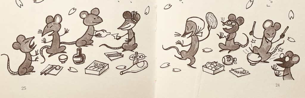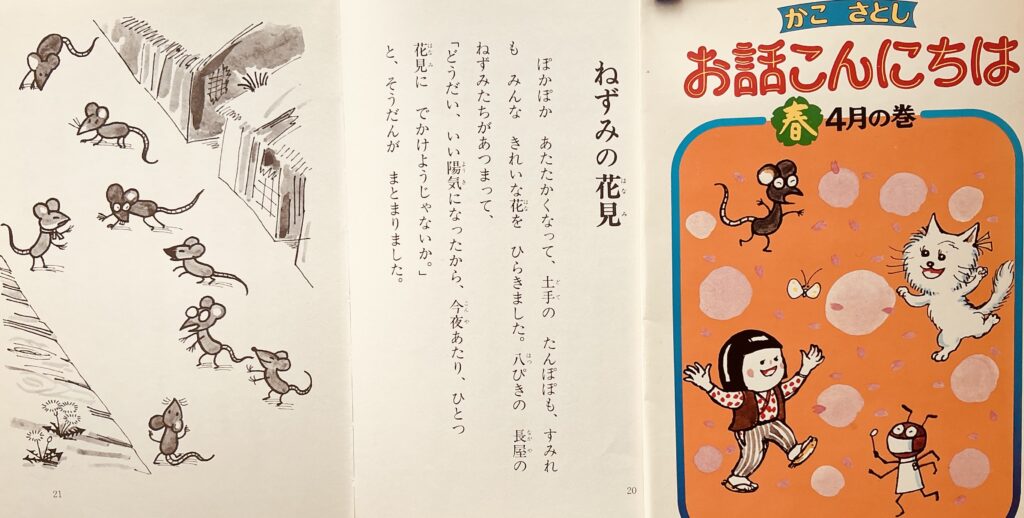 お花見がテーマになったお話しが『お話こんにちは4月の巻』(偕成社)にあります。題は「ねずみの花見」。さくらはさくらでもさくらそうの林で8匹のねずみが賑やかにお花見をはじめたのは良いのですが、どうもお酒やご馳走がなくなるのが早すぎるのです。それは…