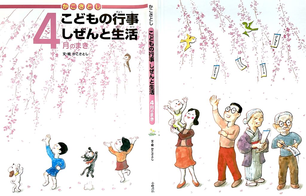 『こどもの行事しぜんと生活4月のまき』(小峰書店)。この見開きに続く次の2ページにも「いろいろなサクラのもよう」が紹介されています。