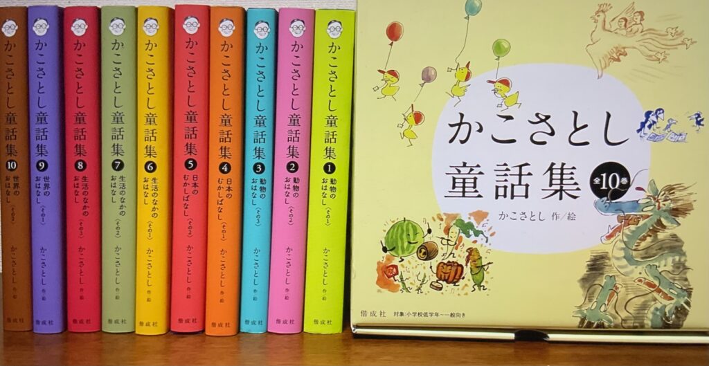 お手元に『かこさとし童話集』(偕成社)がありましたら表紙を開けてご覧ください。普通は遊び紙と言われ何も印刷されないのですが、「かこさとし童話集」の文字が印刷された紙が、フードペーパーです。童話集ではネギとゴボウの2種類を使用、巻末にどちらを使用しているか書いてあります。
