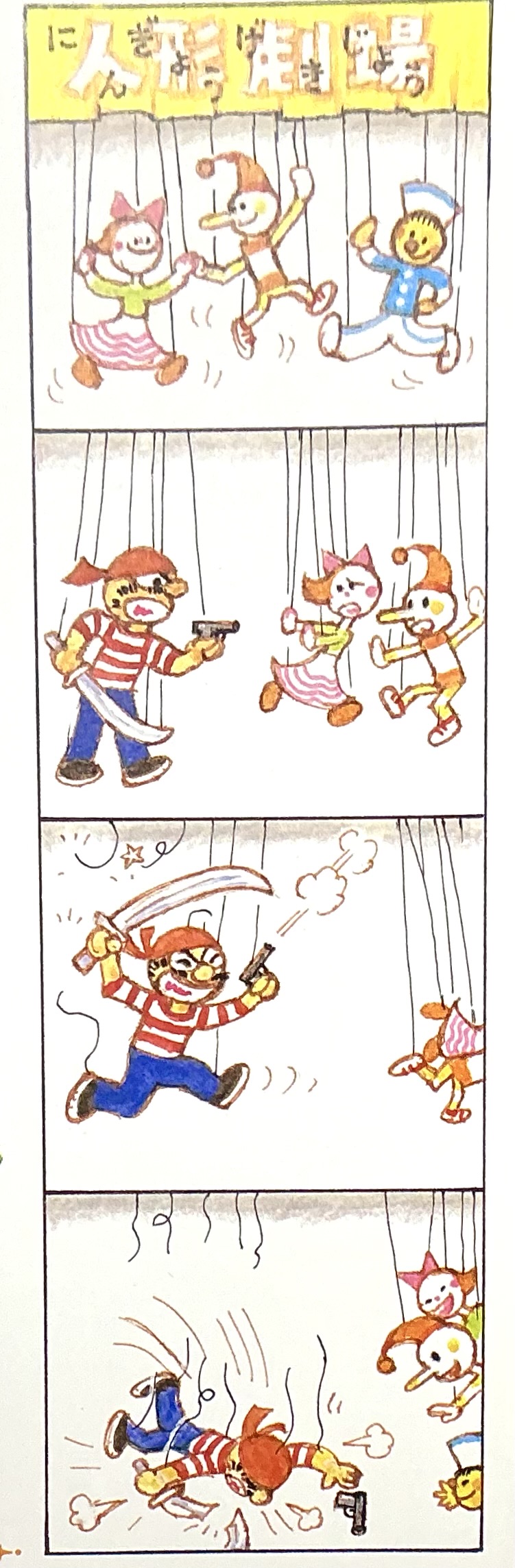 以下は『あそびの大惑星5』(農文協)にある4コマ漫画で人形劇を学んでいた加古らしい内容でユーモア溢れています。