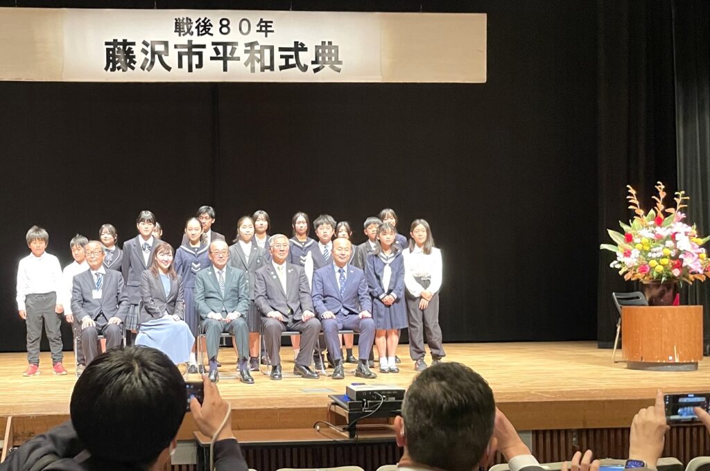 終戦80年藤沢市平和式典が松井一實広島市長、鈴木史朗長崎市長をお迎えし、両市長に続き鈴木恒雄藤沢市長のご挨拶で式典開始となりました。
